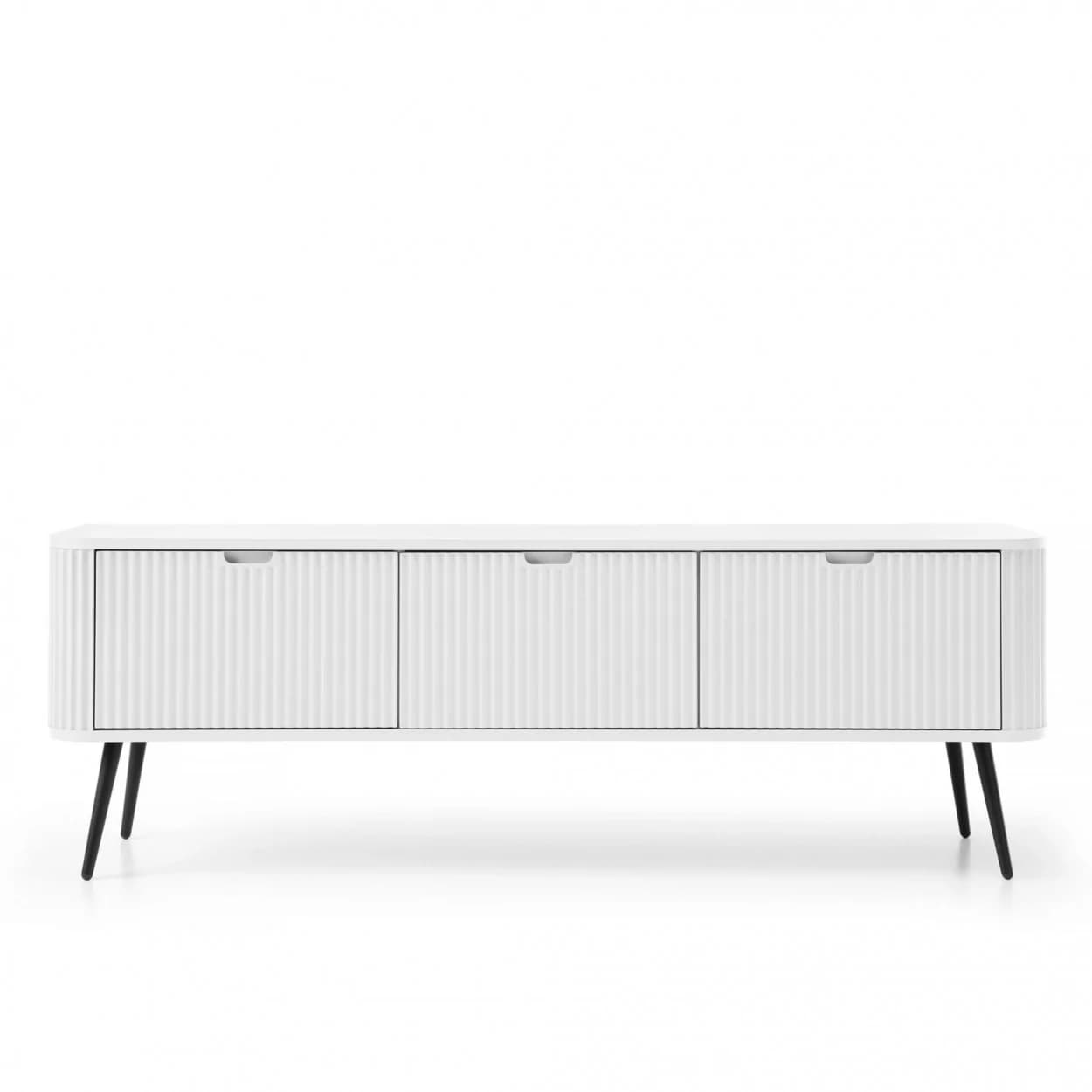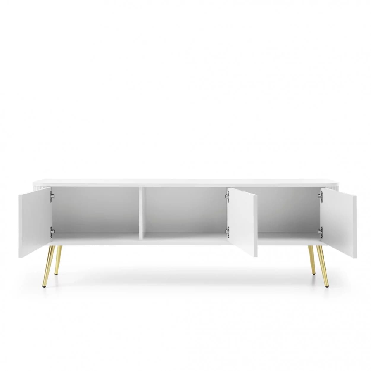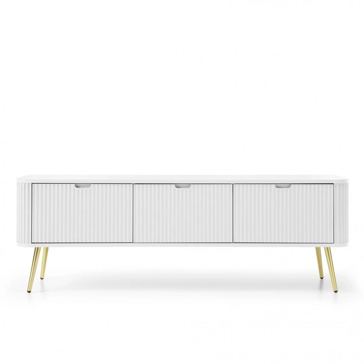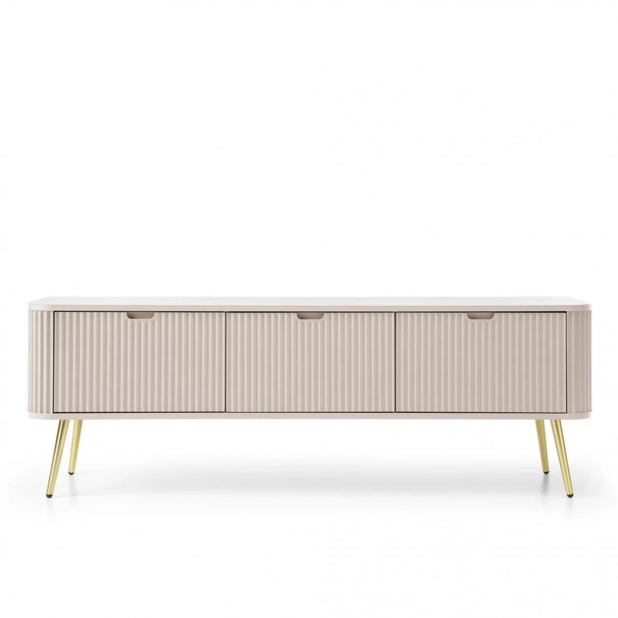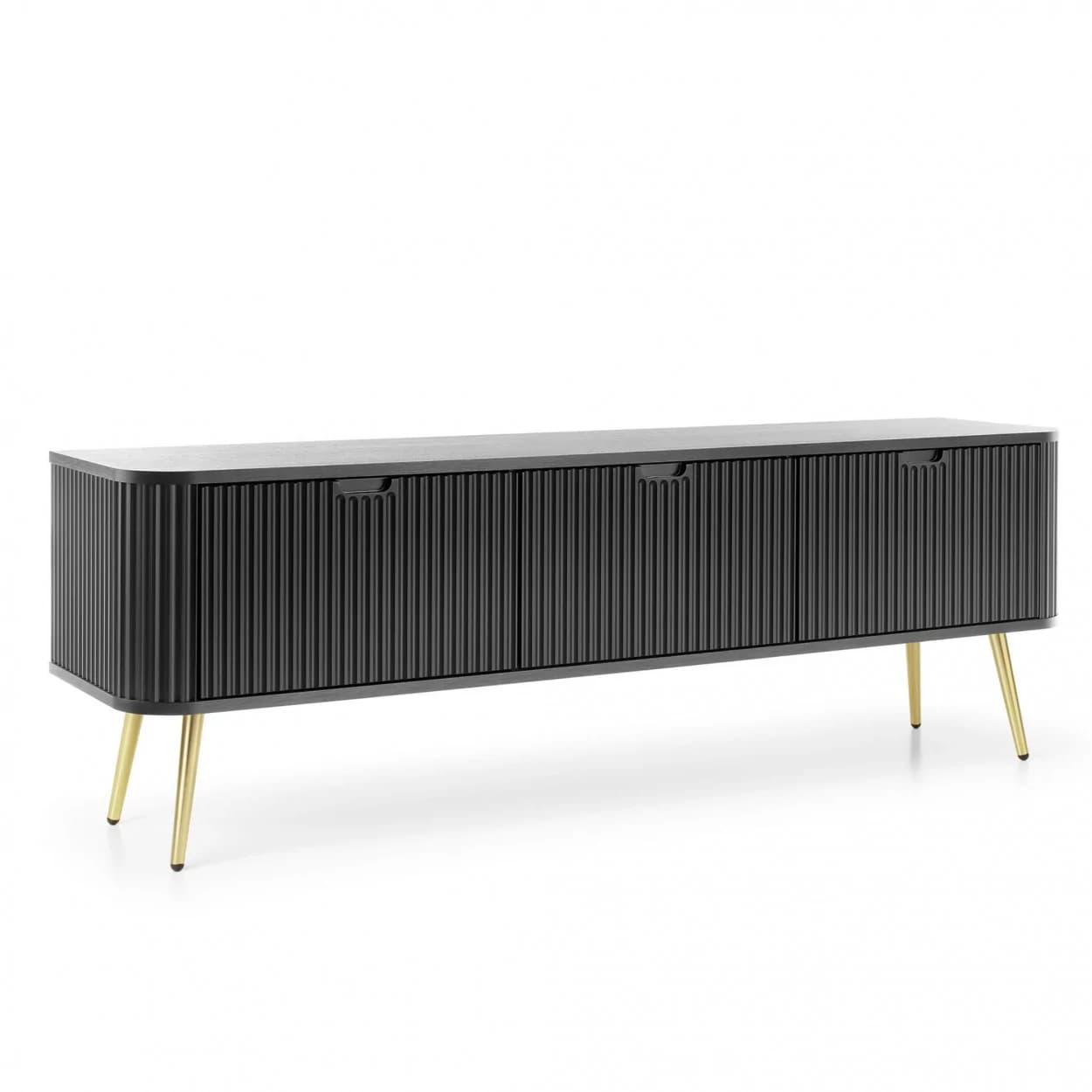Szafka RTV ZOYA trzydrzwiowa to elegancki mebel z ryflowanym frontem i zaokrąglonymi bokami. Nowoczesny design, trzy kolory i metalowe nóżki w złotym lub czarnym wykończeniu.