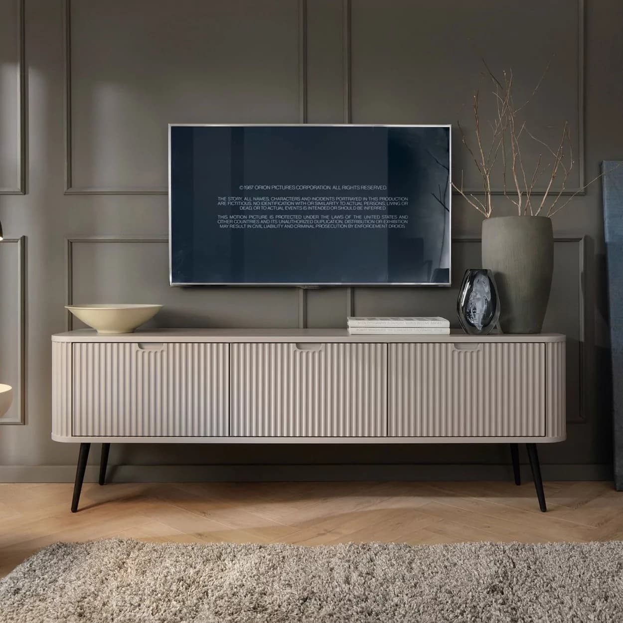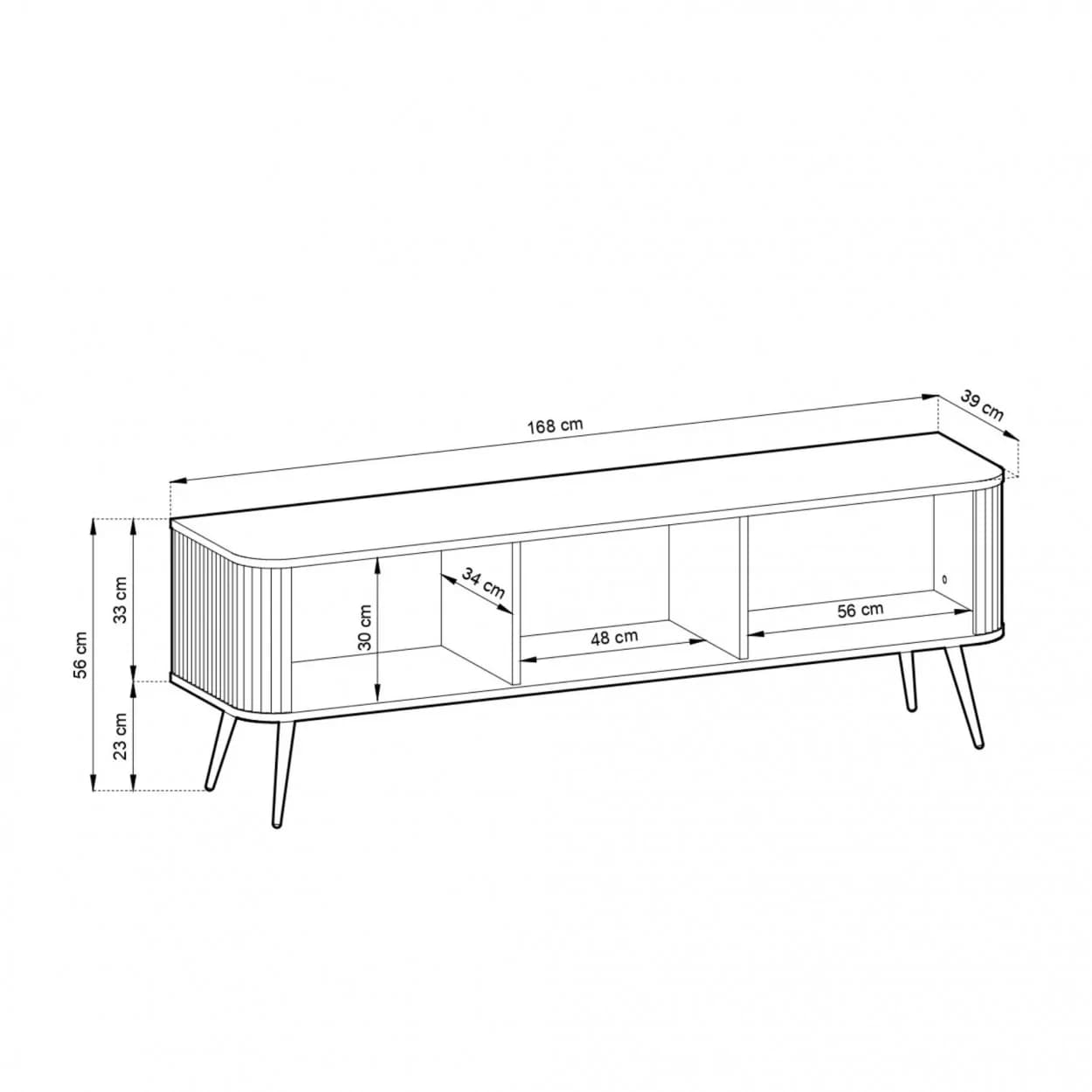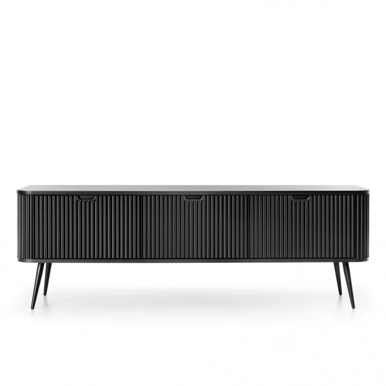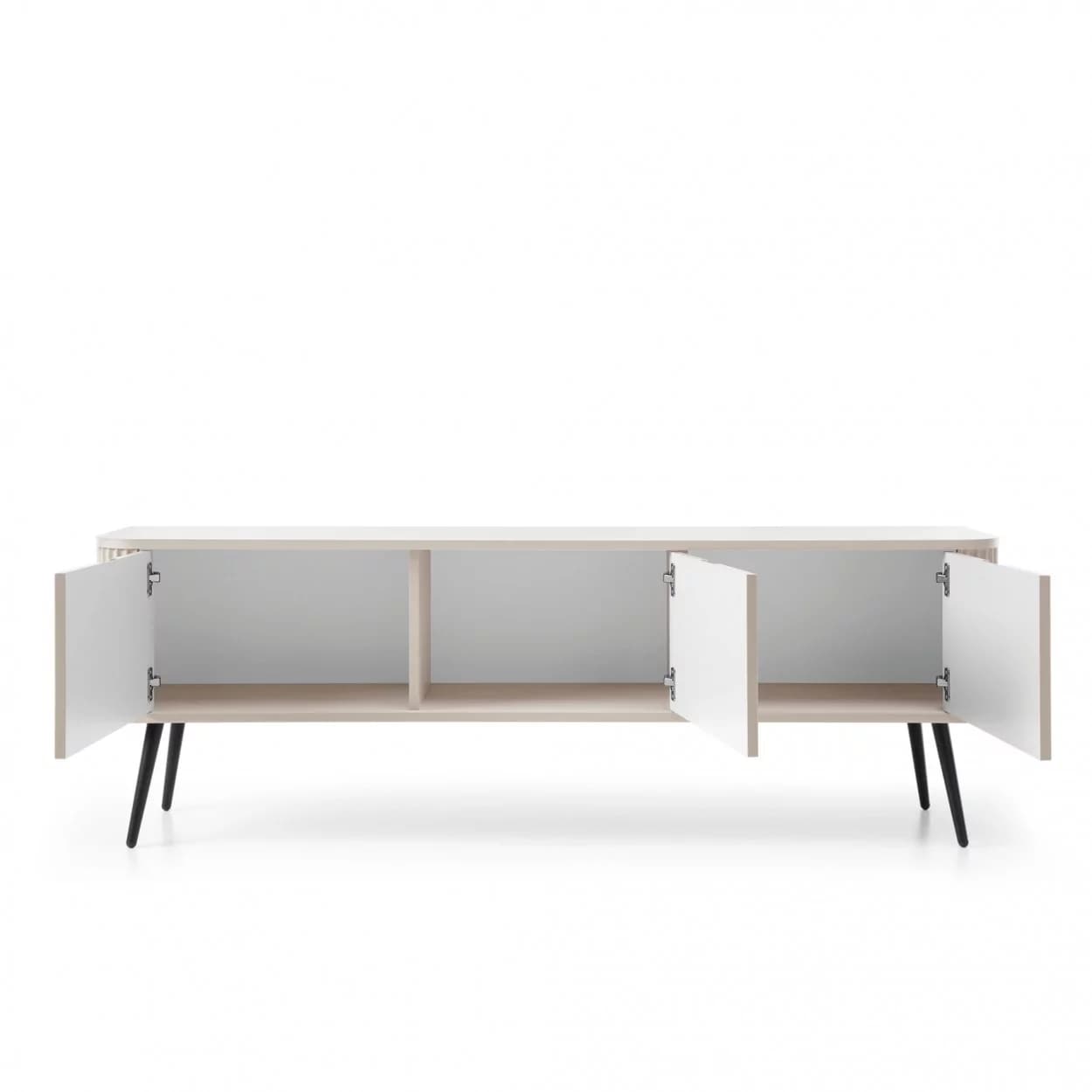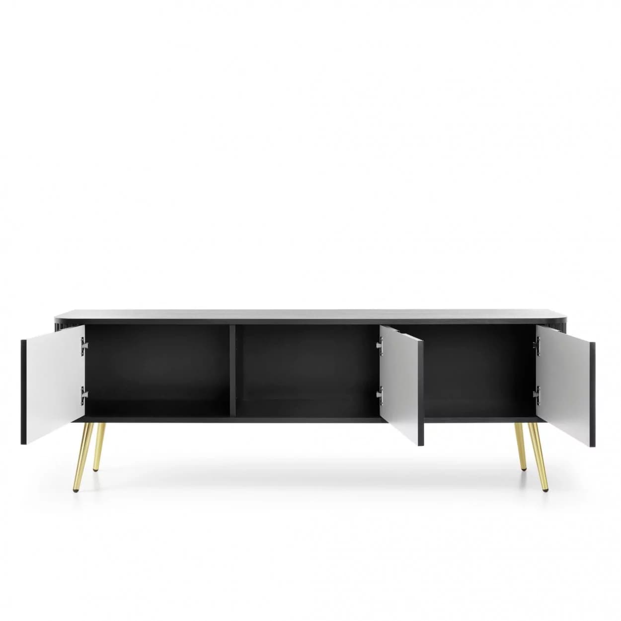 Szafka RTV ZOYA trzydrzwiowa to elegancki mebel z ryflowanym frontem i zaokrąglonymi bokami. Nowoczesny design, trzy kolory i metalowe nóżki w złotym lub czarnym wykończeniu.