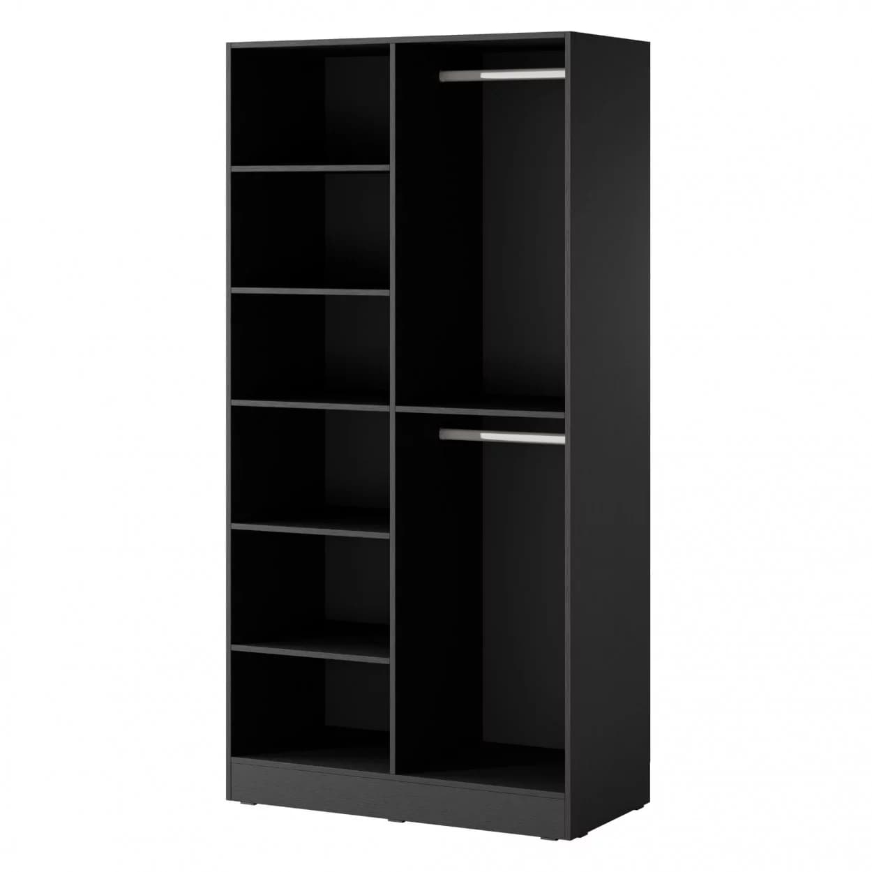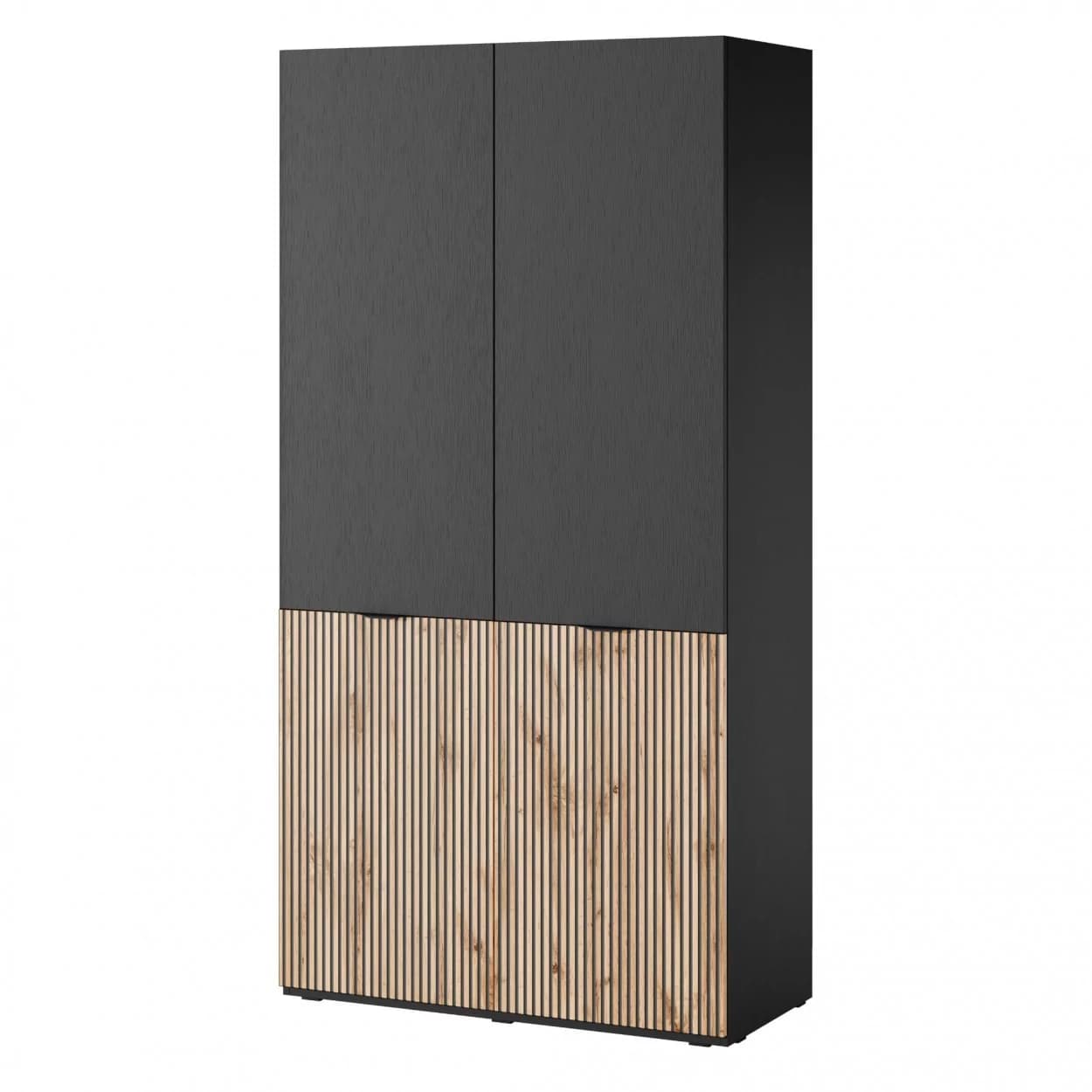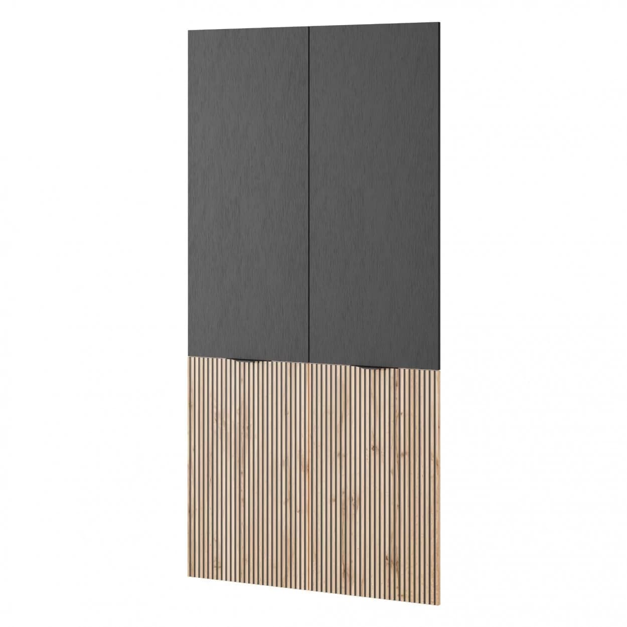 Szafa dwudrzwiowa NOOK w kolorach czarny grafit i dąb wotan, z ozdobnym wzorem w lamele i eleganckimi czarnymi uchwytami. Funkcjonalna i stylowa.