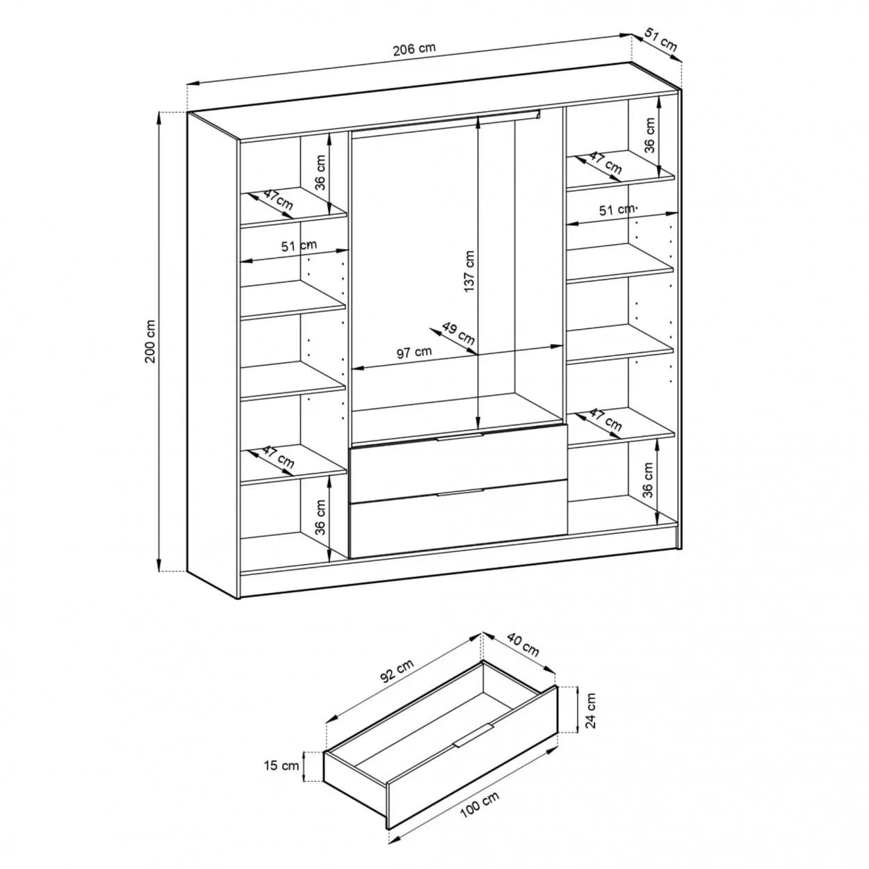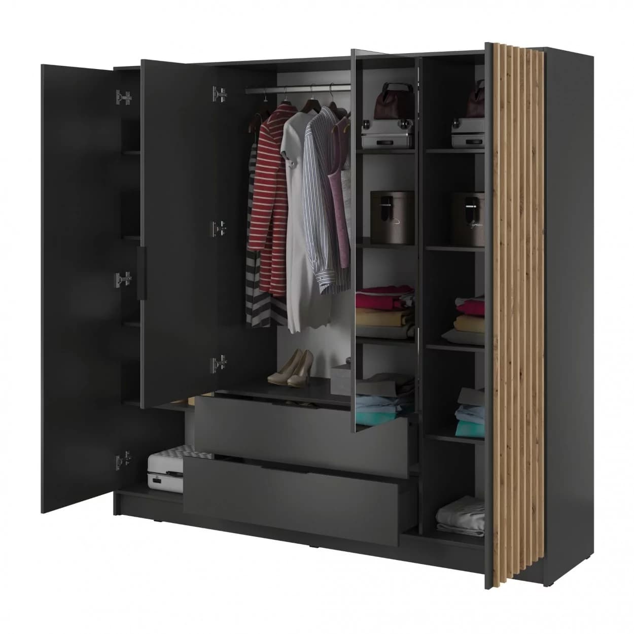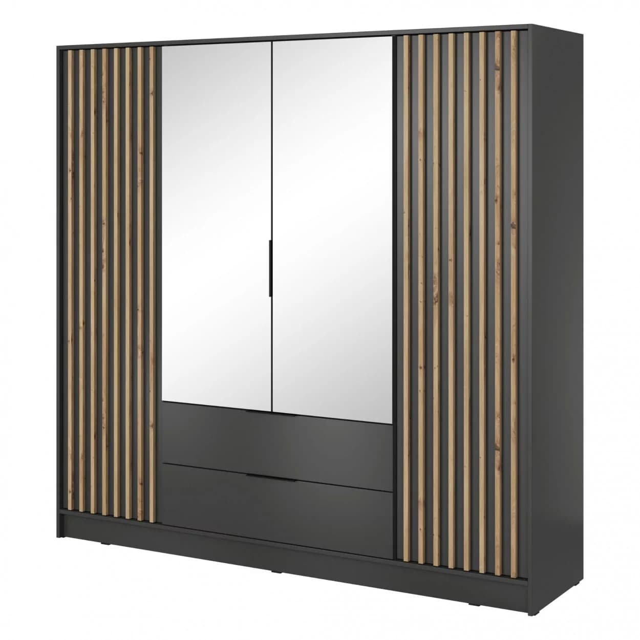 Szafa MONA 4D o długości 200 cm, łącząca grafitowy kolor z lamelami w dębowym odcieniu artisan. Wyposażona w drążek na wieszaki, dziewięć półek, duże lustra na dwóch frontach oraz dwie pojemne szuflady. Funkcjonalna i elegancka.