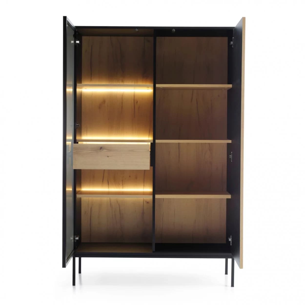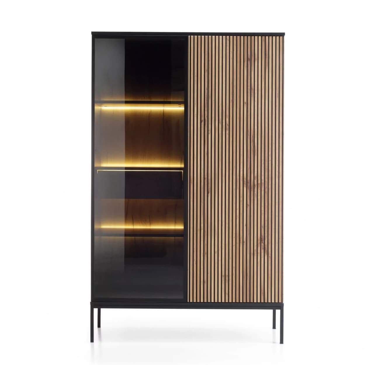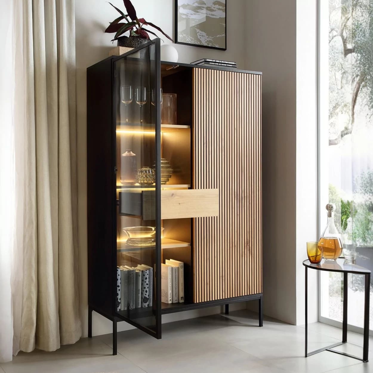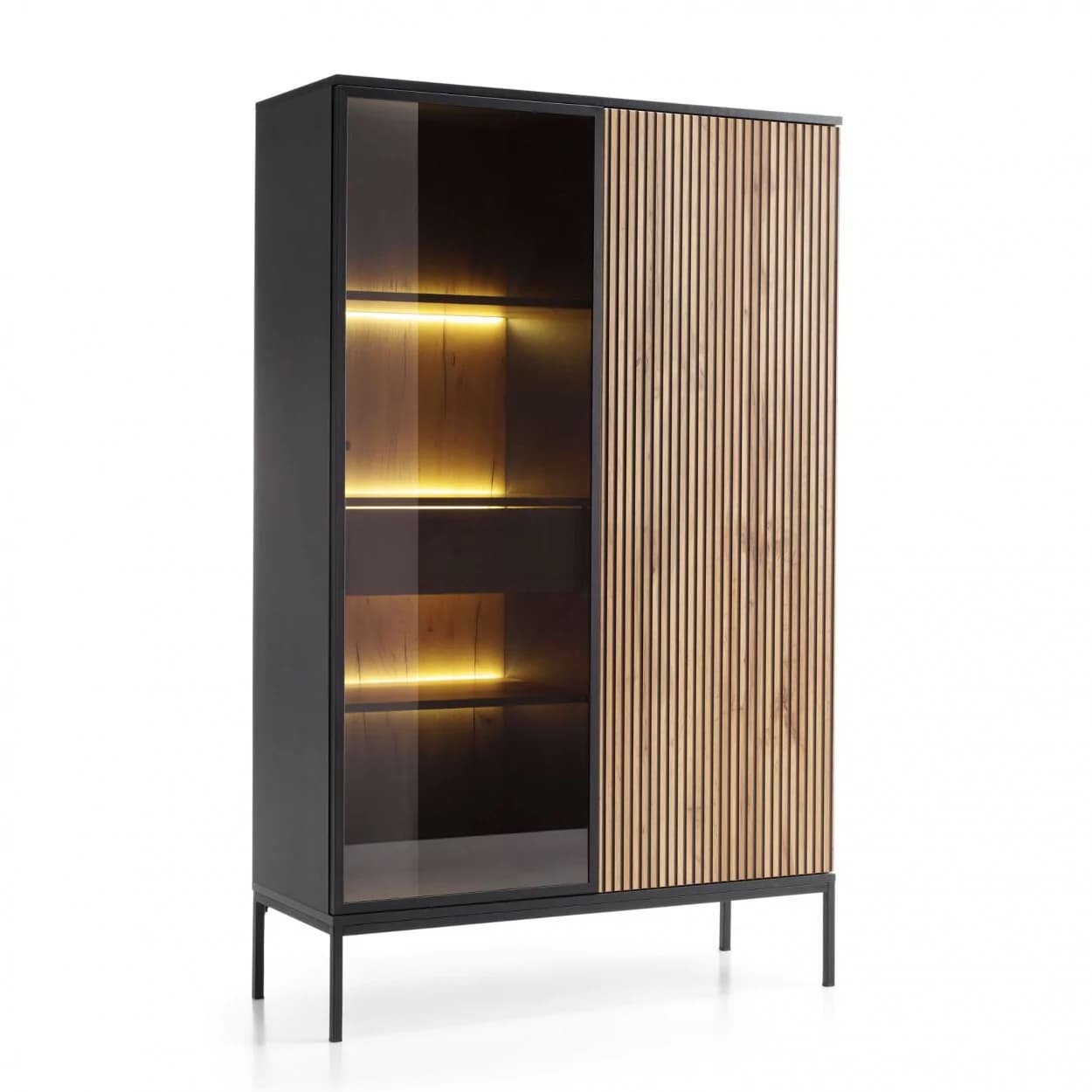 Witryna SORENTO w czerni z oświetleniem LED i 3D lamelami w odcieniu dębu wotan. Nowoczesna, stylowa i praktyczna.